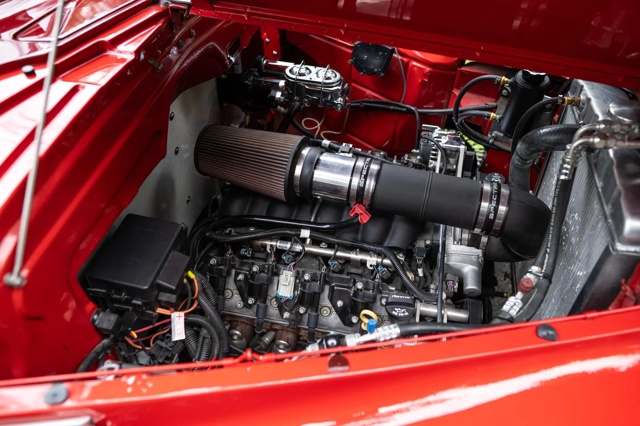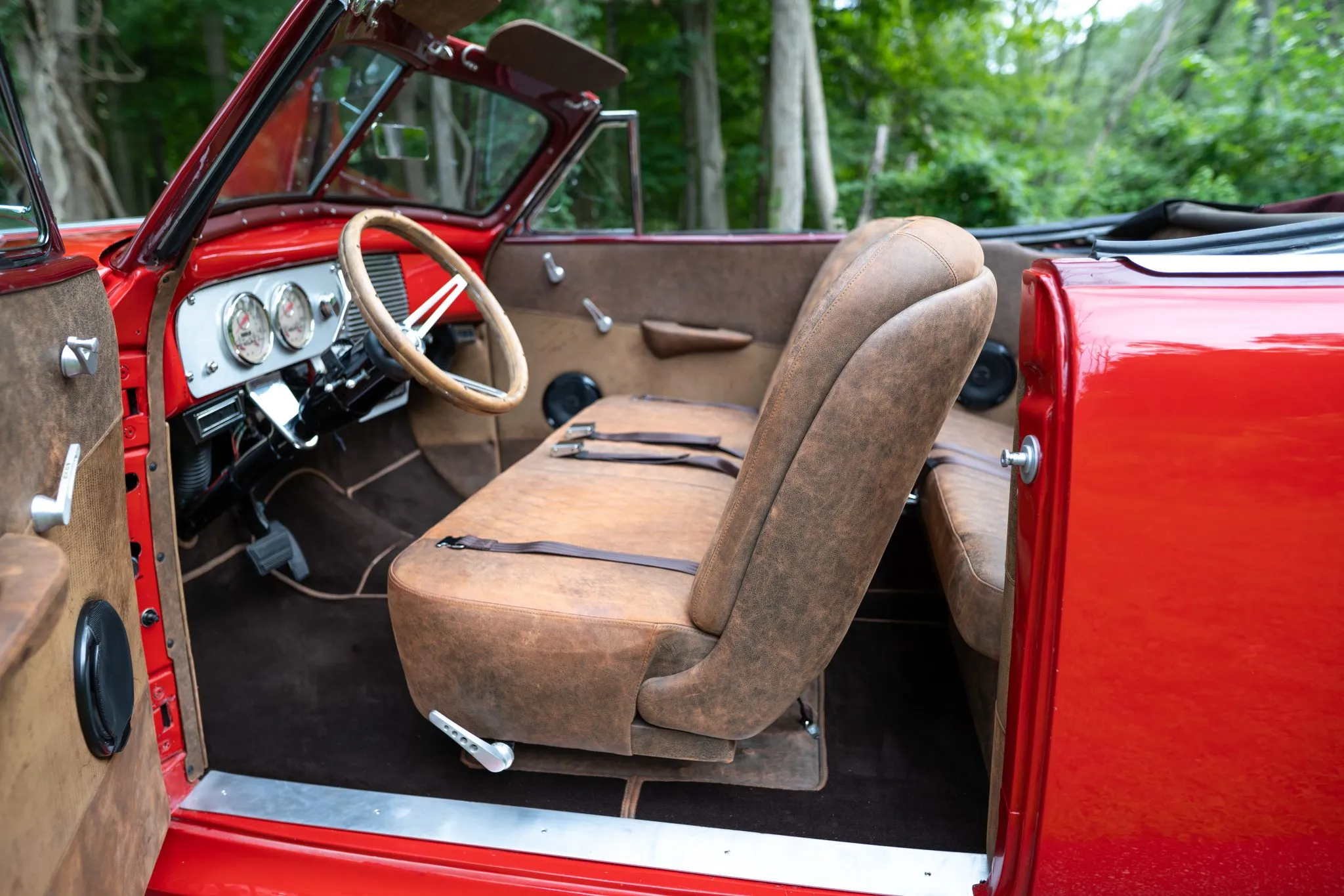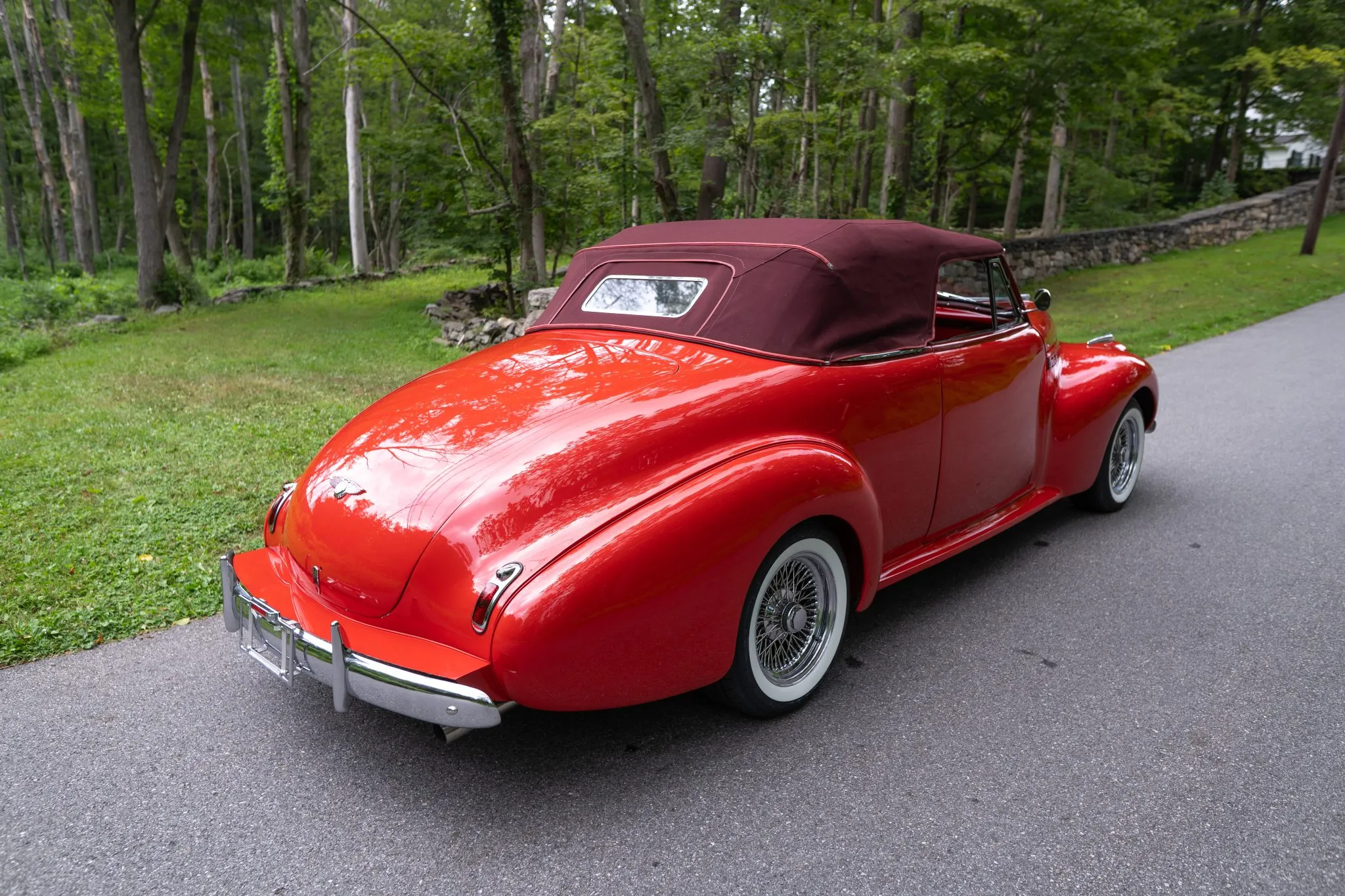 This 1940 Buick Series 50 Super Convertible was customized and modified in 2014. The original frame and suspension was replaced with a custom chassis with Corvette C4-based suspension, and it rides on Strange Engineering adjustable coilovers with 16″ Dayton knock-off wire wheels mounted over disc brakes at each corner. Power comes from a GM Performance 6.2-liter LS3 V8 linked to a GM 4L65E automatic transmission. Inside, the car has a custom two-tone upholstery, diamond-stitched seats, Vintage Air climate control, and a modern stereo. The custom dashboard has New Vintage Woodward gauges and a one-off ignition dial with a push-button starter. In preparation for the sale the BFGoodrich whitewall tires were installed, Russell Performance braided front brake hoses were installed, and the accessory belt and fluids were changed.
