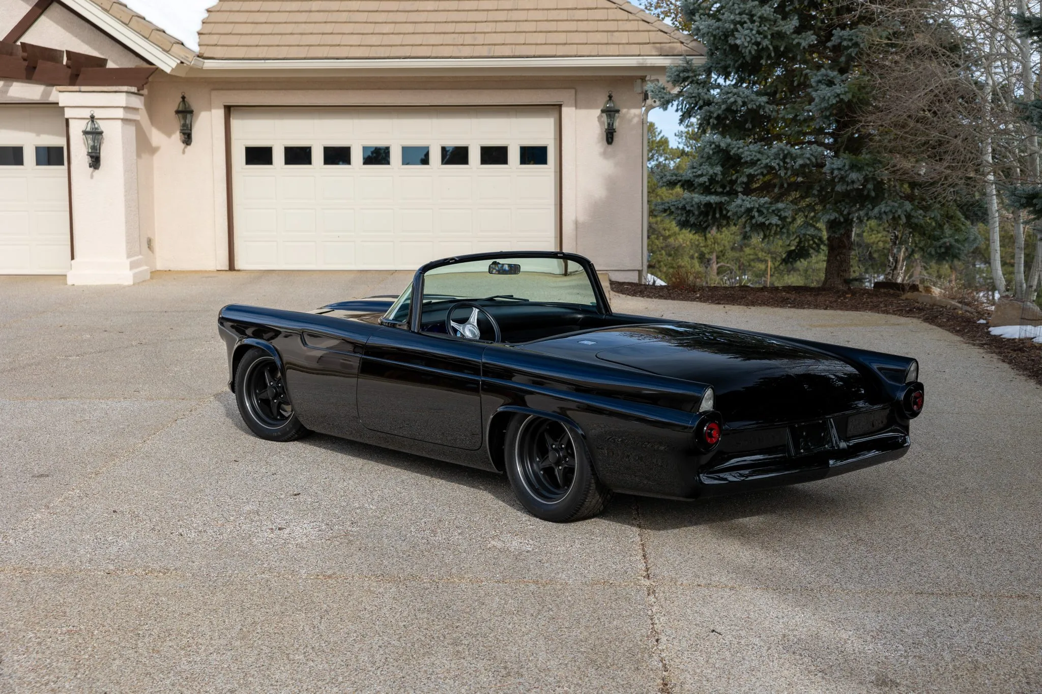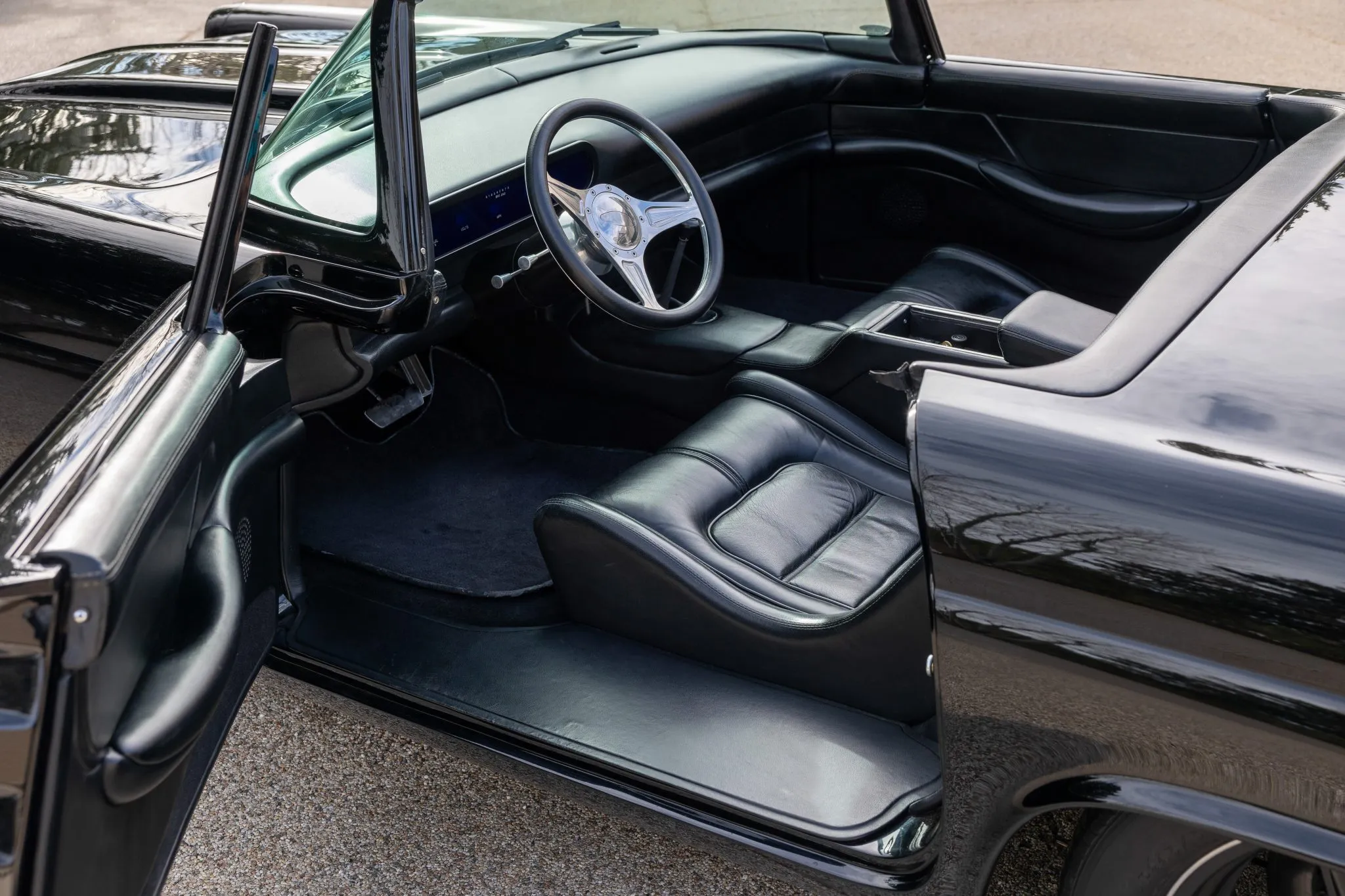 This modified Ford Thunderbird roadster replica features a fiberglass body mounted over an Art Morrison frame and is powered by a Chevrolet-based 406ci stroker V8 linked to a four-speed automatic transmission. The car is finished in black and is equipped with an Edelbrock intake manifold and mufflers, tubular exhaust headers, a revised camshaft and lifters, Keith Black pistons, billet pulleys, black 16″ wheels, adjustable coilovers, power-assisted rack-and-pinion steering, four-wheel disc brakes, and Dutchman axles. The cabin is fitted with contoured bucket seats trimmed in black leather along with an Alpine stereo system and power windows.