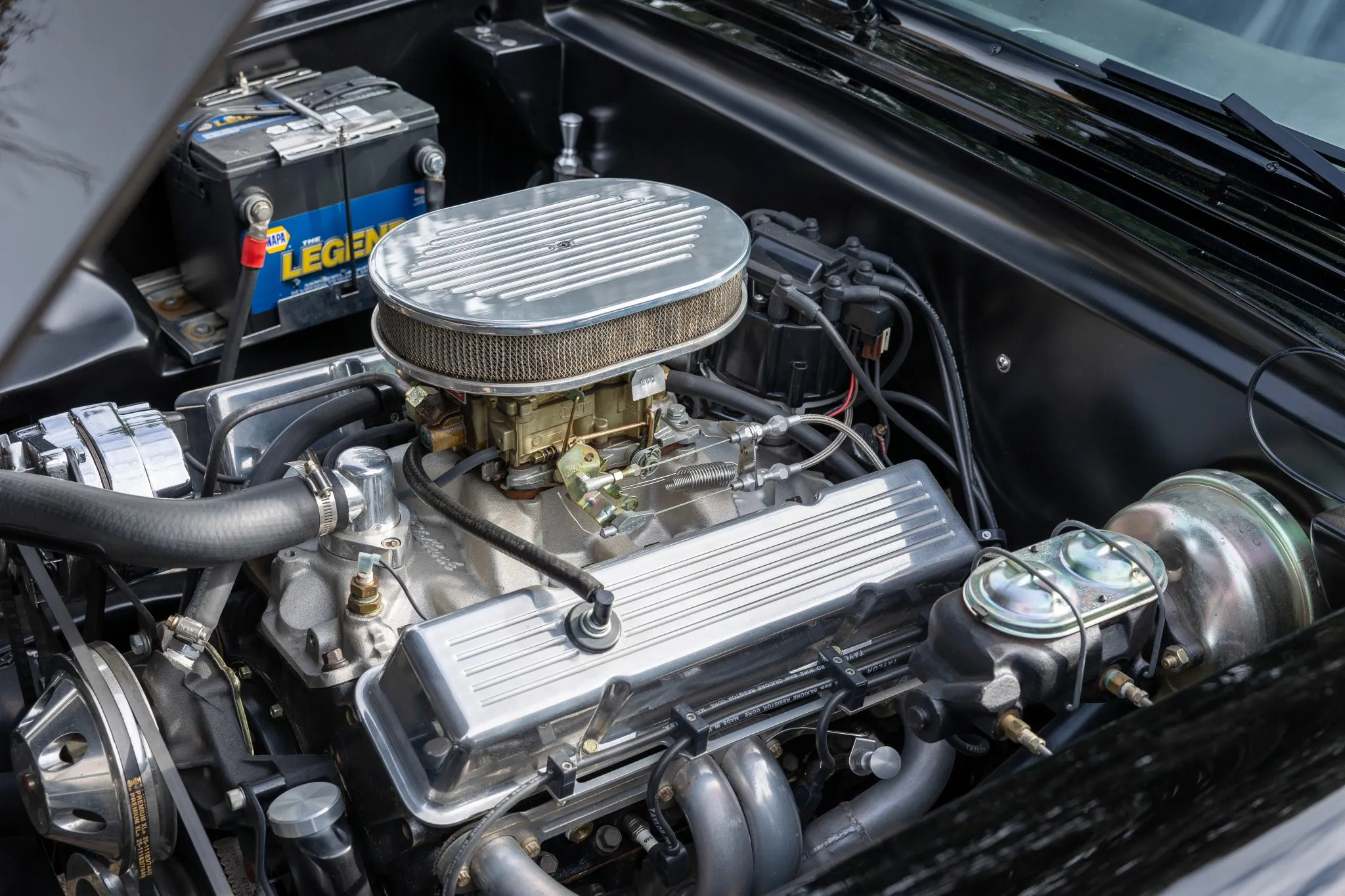 Five-spoke black-finished 16″ alloy wheels are mounted with 225/50 front and 245/50 rear Goodyear Eagle tires. The car rides on an Art Morrison chassis and coilover suspension, and power-assisted rack-and-pinion steering is installed. Braking is provided by power-assisted four-wheel discs.