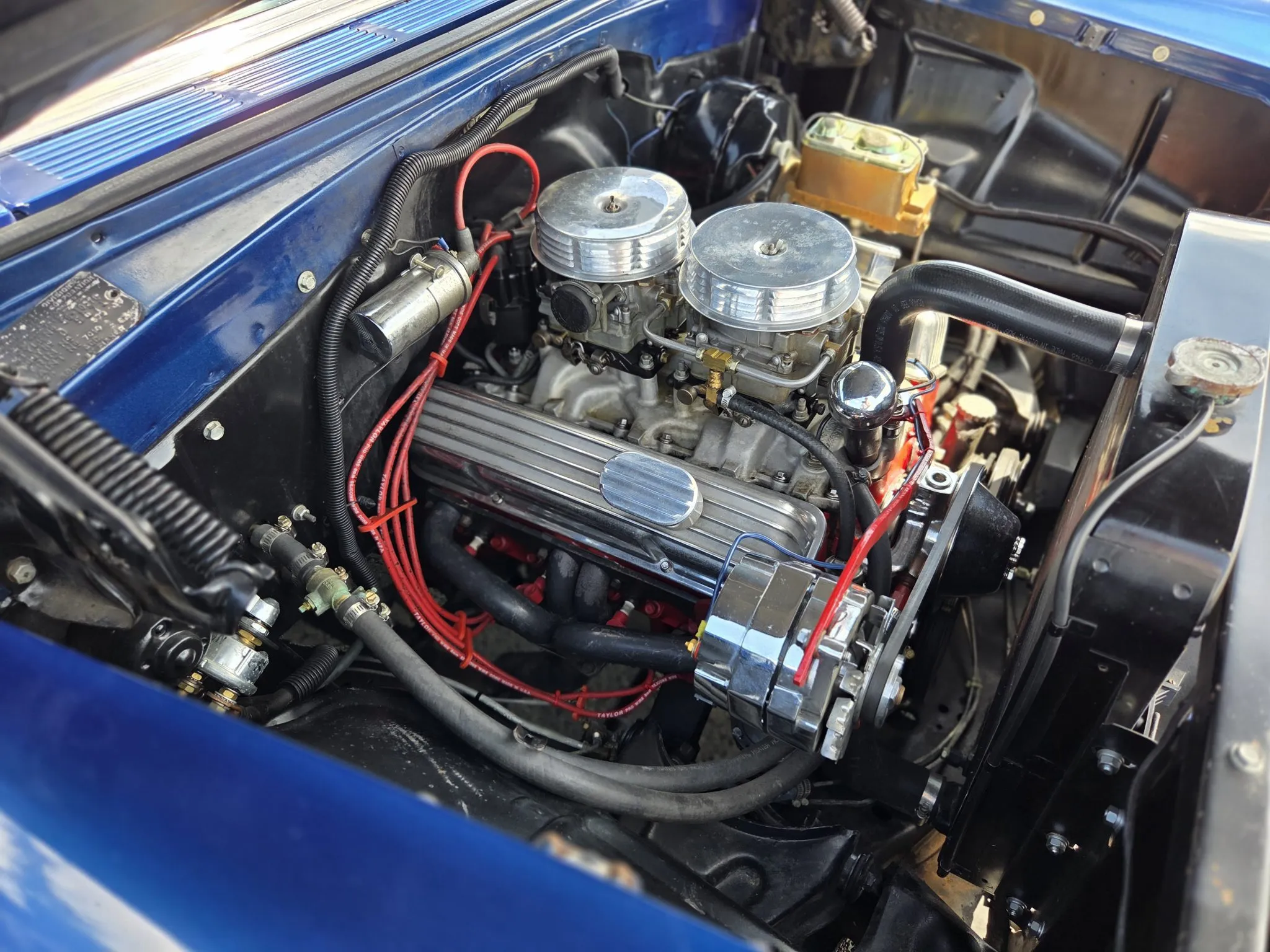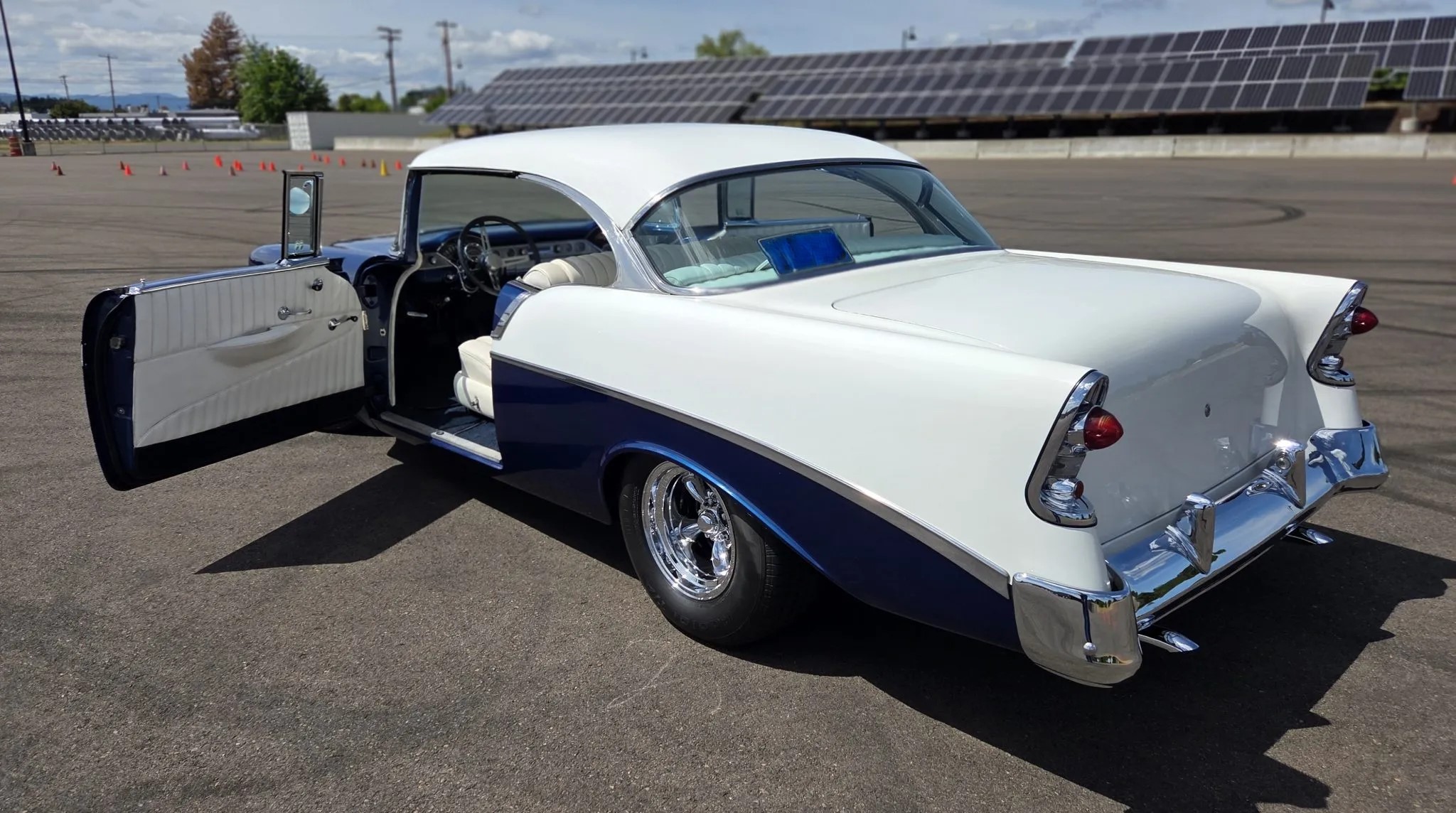 This 1956 Chevrolet Bel Air two-door hardtop was purchased in the early 1980s, and refurbishment work in the late 1980s included a repaint in metallic blue and white after the body was nosed and decked. Power is provided by a 327ci V8 that was rebuild in 2012 and is topped with a dual-quad induction setup. The four-speed manual transmission is linked to a narrowed 9″ rear end with a 3.73:1 limited-slip differential, and the chassis features power steering along with power-assisted front disc brakes. Inside, the bench seats are trimmed in white leather and accompanied by an aftermarket floor shifter and a column-mounted tachometer. Additional equipment includes an electric radiator fan, coated exhaust headers, and 15″ American Racing Torq Thrust wheels.