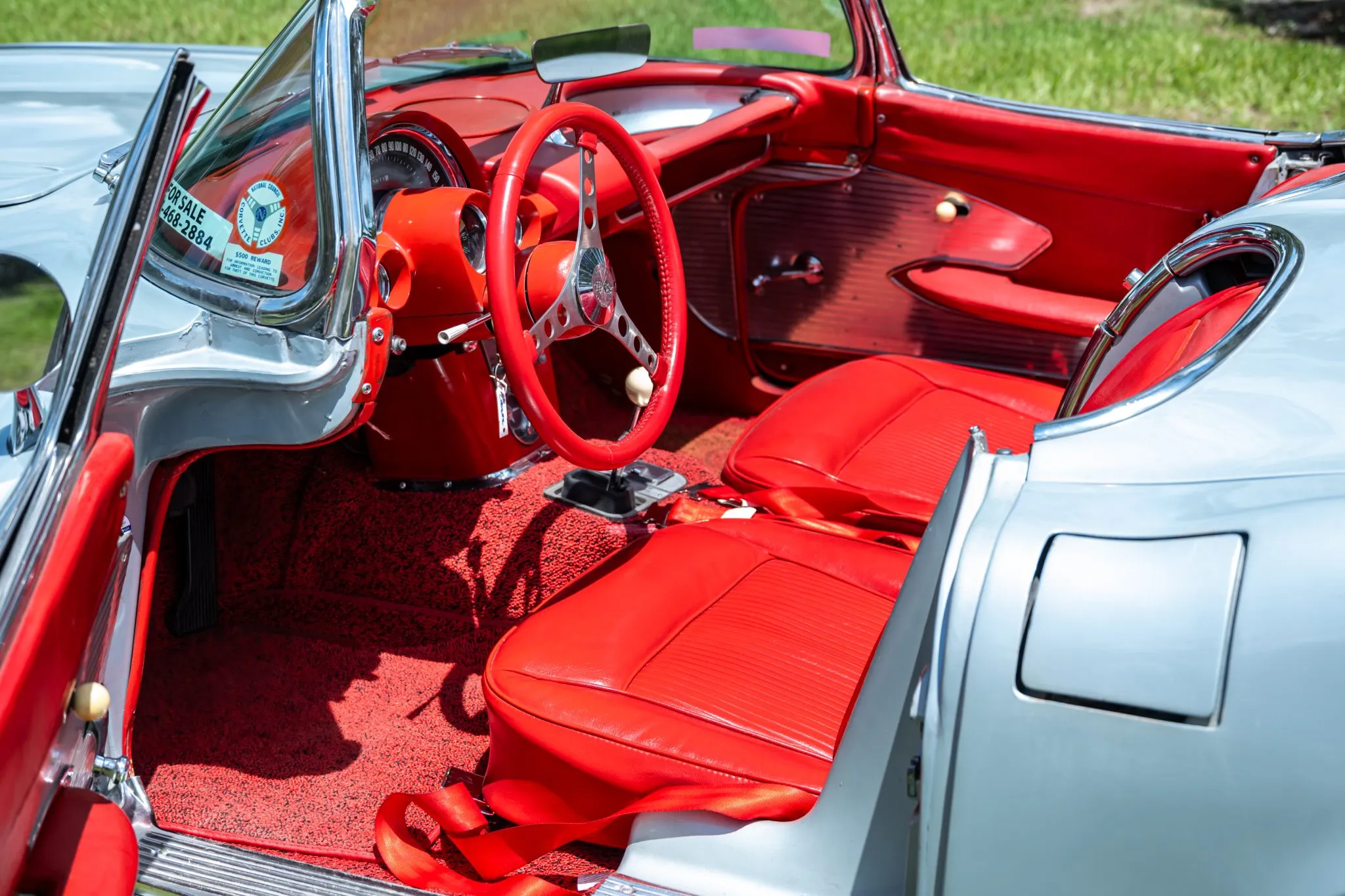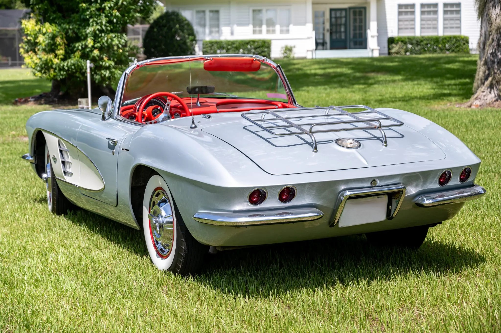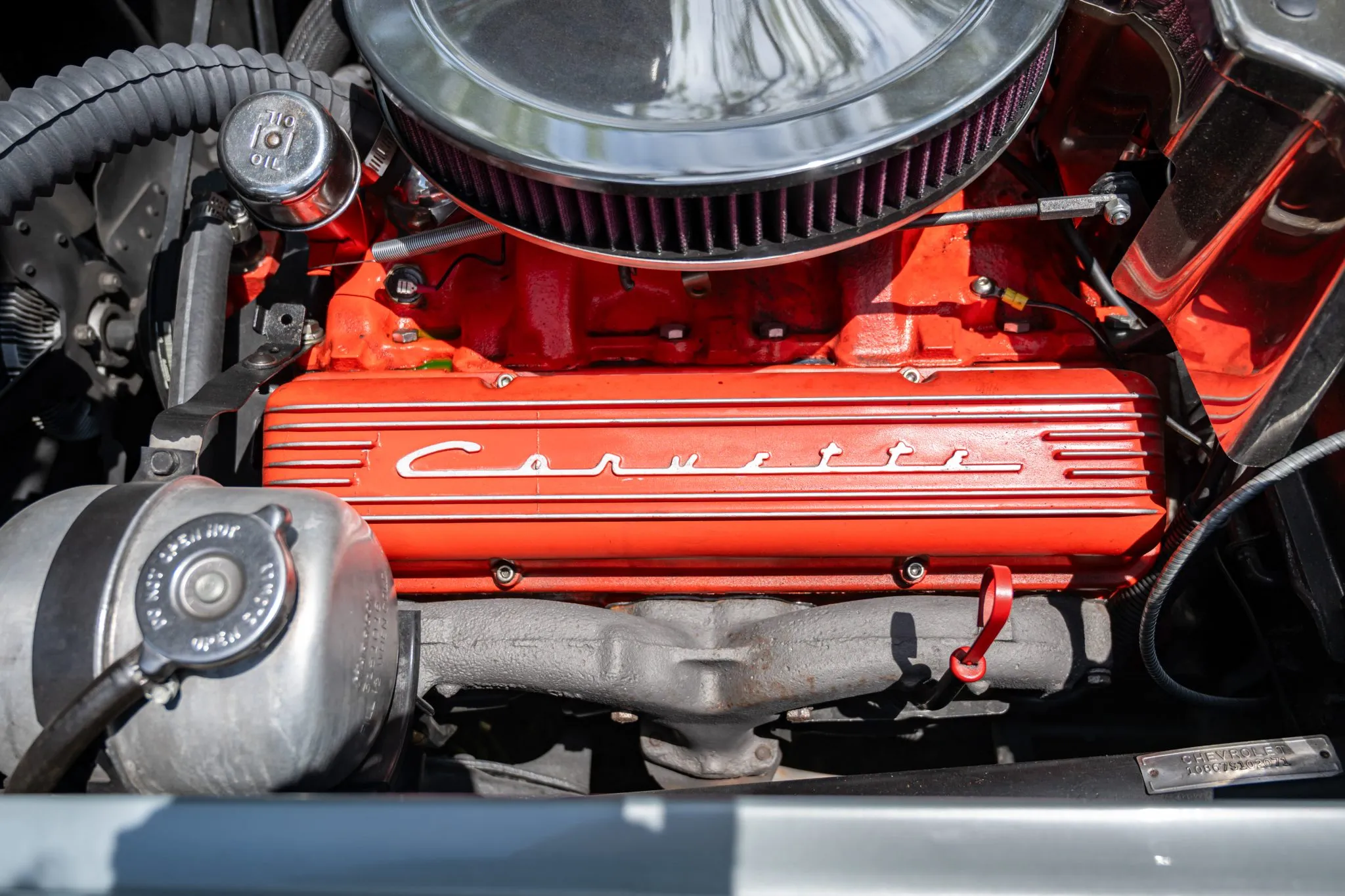 This 1961 Chevrolet Corvette is powered by a 283ci V8 paired with a four-speed manual transmission and is finished in silver over red vinyl. Features include a removable hardtop, a black soft top, 15″ steel wheels, a luggage rack, and a cassette stereo. A PerTronix Flame-Thrower ignition system and a Melling camshaft and lifter kit were installed as part of a 2024 major service, at which time the clutch, fuel tank, carburetor, distributor, timing chain, gaskets, tires, carpeting, seatbelts, and more were replaced.