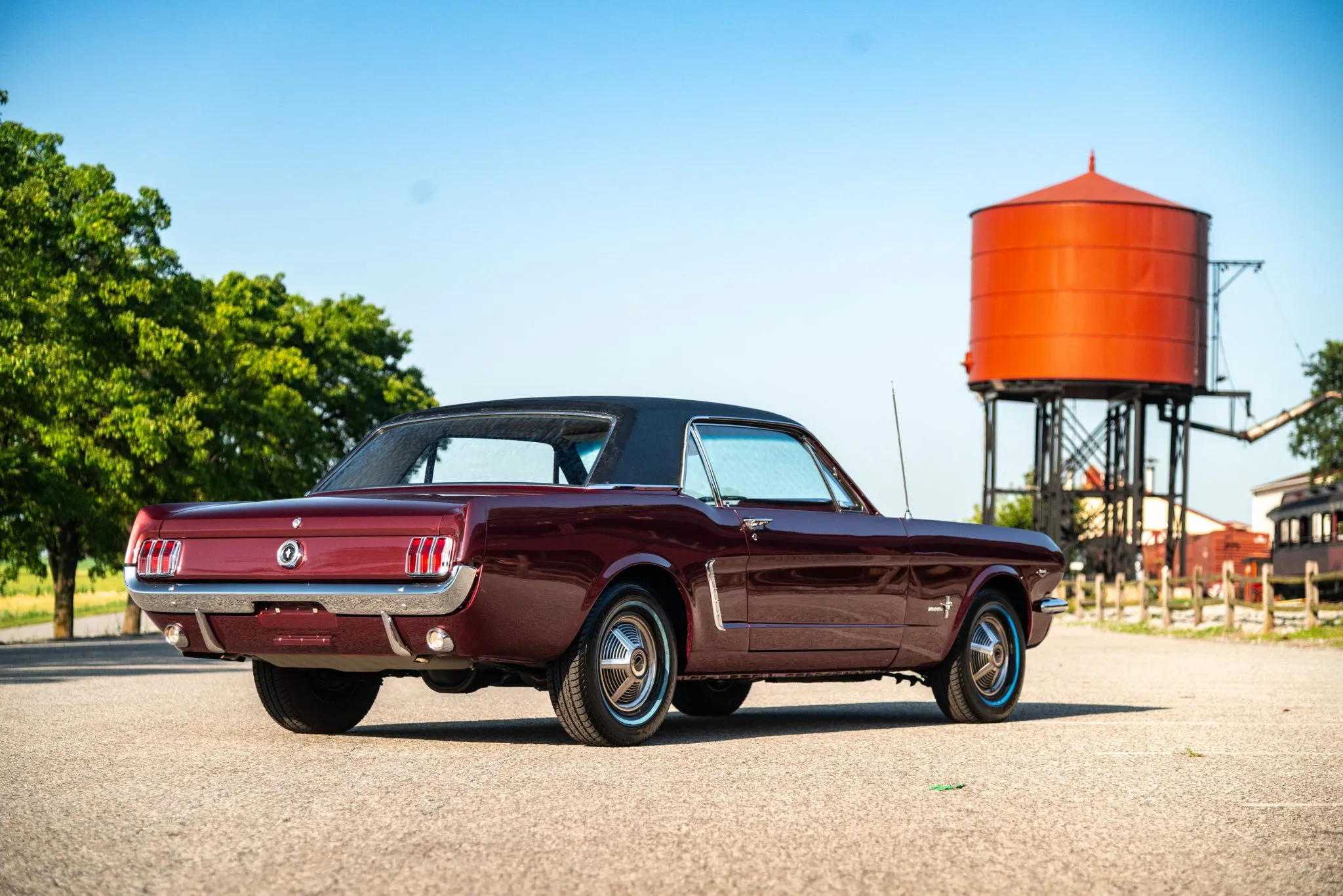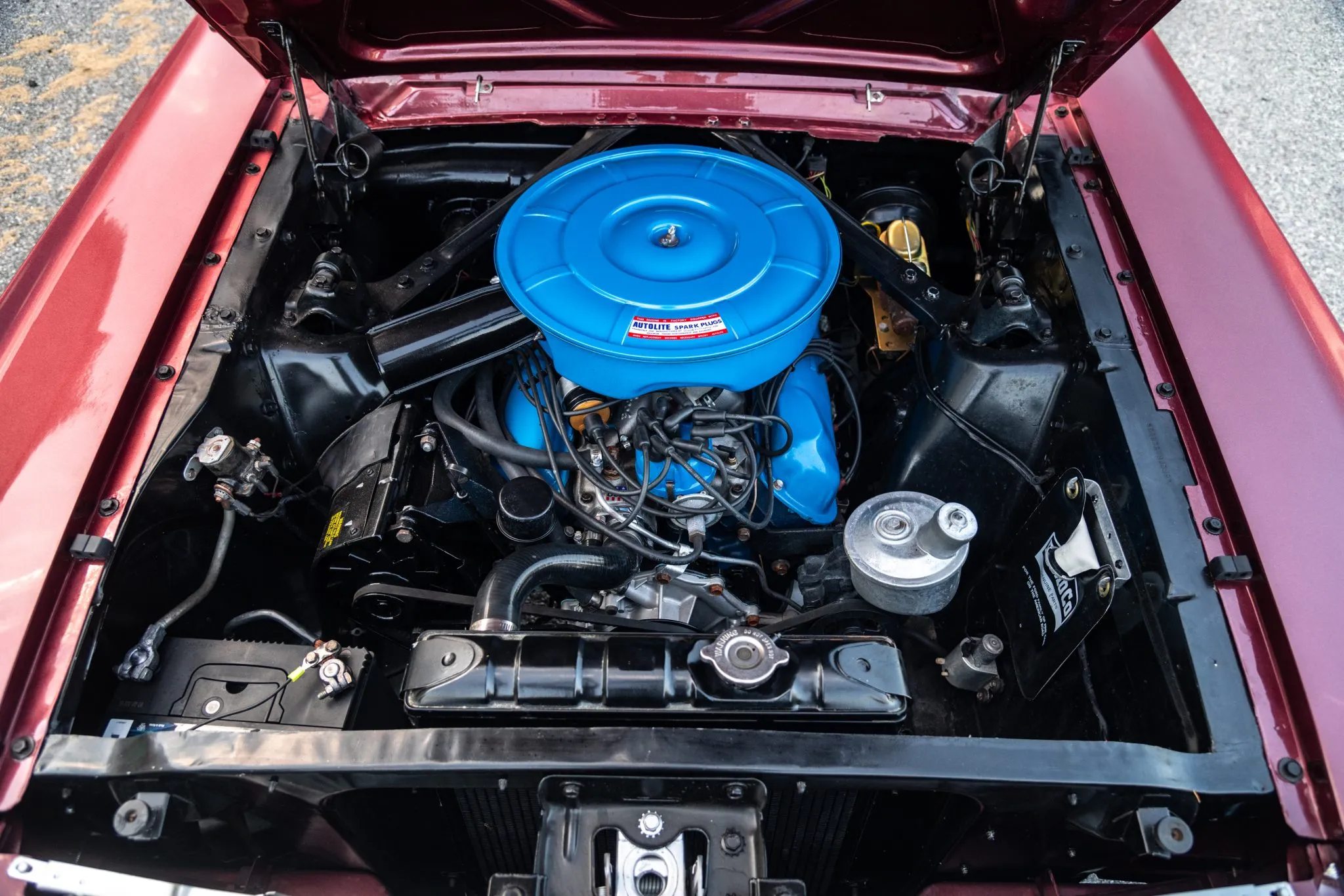 This 1964.5 Ford Mustang was built in April 1964 as a F-code 260 coupe with Vintage Burgundy paintwork, black vinyl upholstery, bucket seats, and a C-4 automatic. The 14″ steel wheels wear full covers and Uniroyal Tiger Paw tires. A front disc brake conversion has been fitted. The cabin features front bucket seats and a rear bench trimmed in black vinyl. The car has a center console and a push-button AM radio. Instrumentation consists of 120-mph speedometer flanked by temperature and fuel gauges, and Rally Pac-style instruments are mounted on the column. The five-digit odometer shows under 17k miles, approximately 500 of which were added under current ownership. The 260ci V8 was factory rated at 164 horsepower. The radiator and driveshaft were replaced.