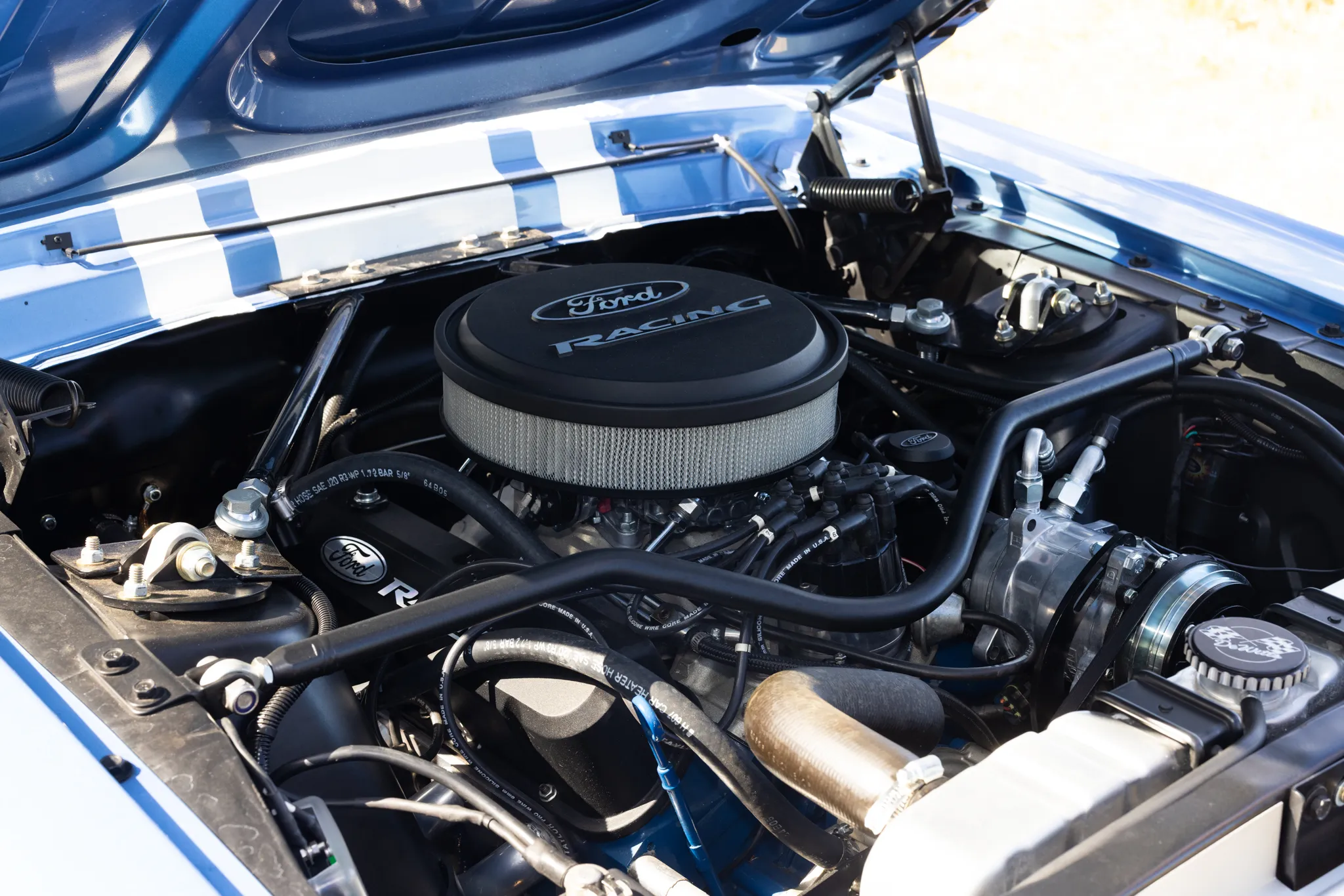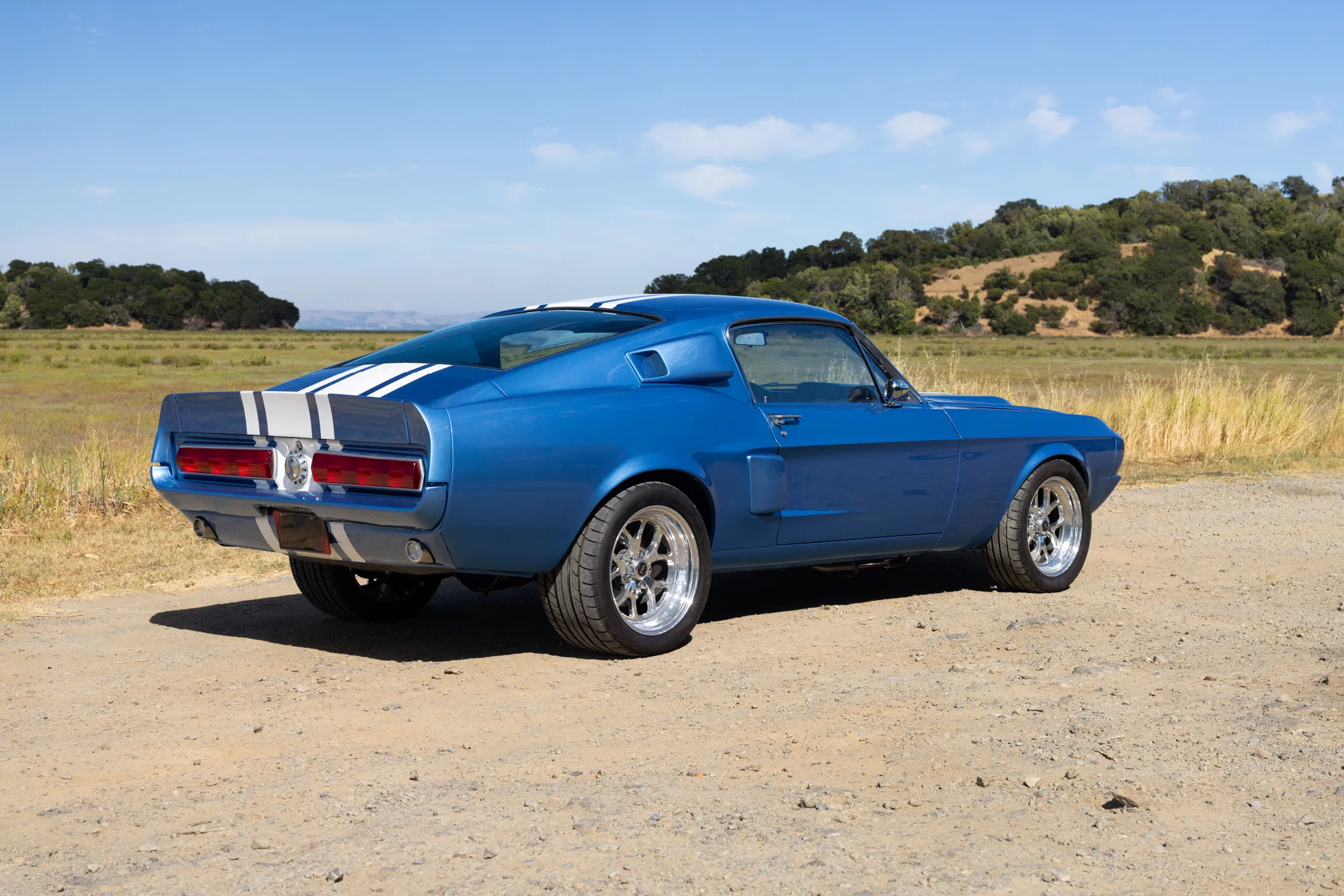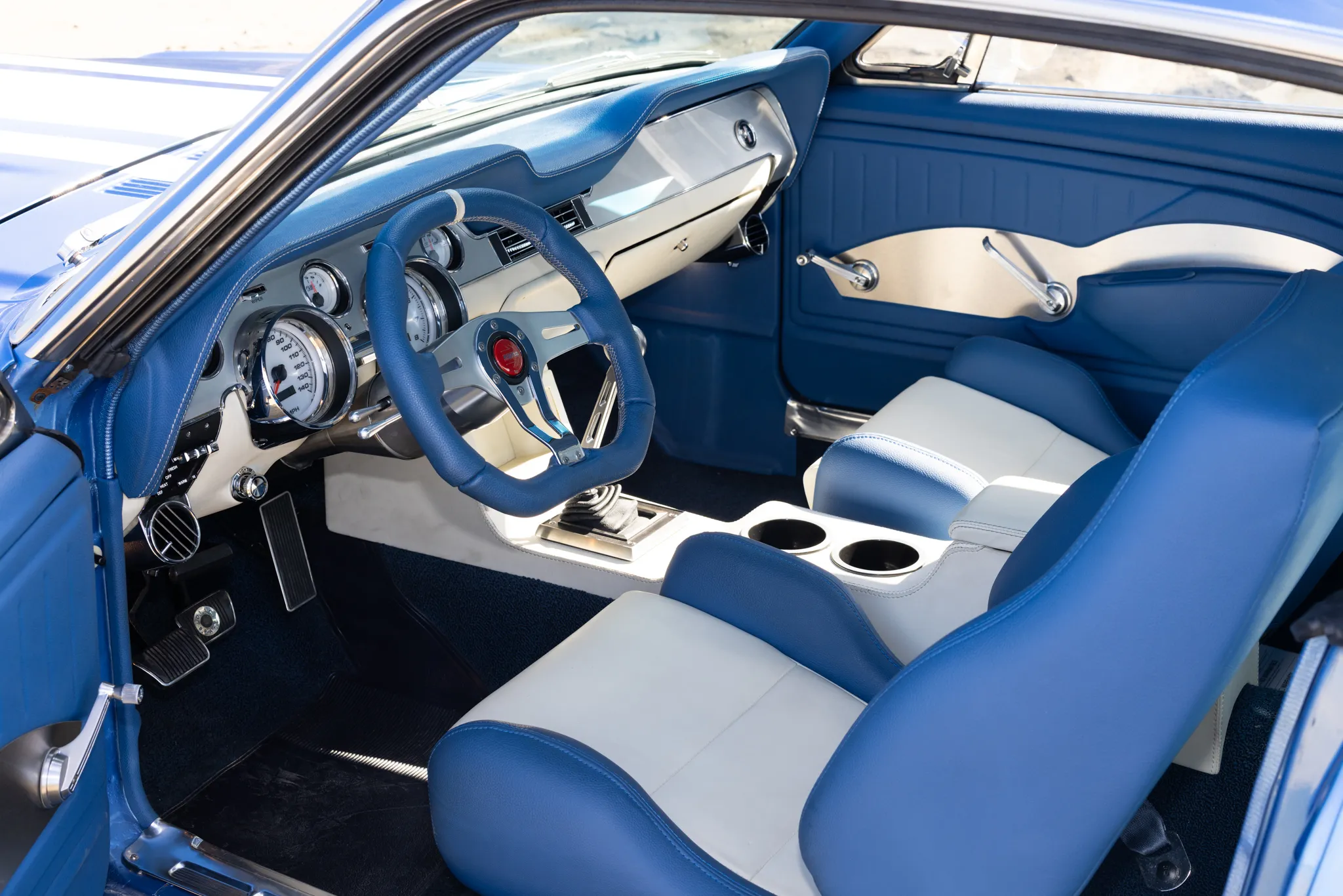 This 1967 Ford Mustang began as a C-code fastback, and it was refurbished and modified in 2021. The body was fitted with Shelby-style details and refinished metallic blue with white stripes, and the car rides on a modified suspension with tubular front control arms, a four-link rear end, and Alden American coilovers. Four-wheel disc brakes, Borgeson quick-ratio power steering, and staggered 17″ Weld Racing wheels were also used. Power comes from a 347ci stroker V8 with forged pistons, AFR heads, and a Holley carburetor, and it is linked to a Tremec TKO five-speed manual transmission with a hydraulic clutch and a Ford 9″ rear end with 3.90 gears. The interior was also customized with two-tone upholstery, bucket seats, a center console, a tilt column, air conditioning, and modern gauges.