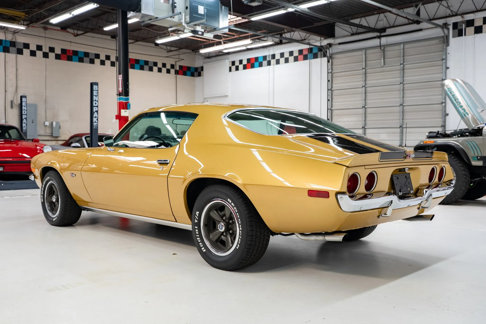 1970 Chevrolet Camaro Z/28. The car is finished in Camaro Gold over Sandalwood vinyl and powered by a 350ci Turbo-Fire V8 linked with a Muncie M21 four-speed manual transmission and a 12-bolt rear axle with a Positraction differential. It rides on 15″ five-spoke wheels and is further equipped with front disc brakes, a Hurst shifter, and a replacement dual exhaust system. The 15″ five-spoke wheels were mounted with 235/60 BFGoodrich Radial T/A tires in 2024, according to the selling dealer. The Z28 package included higher-rate springs and shocks, front and rear stabilizer bars, and a quick-ratio steering box. Braking is provided by front discs and rear drums.