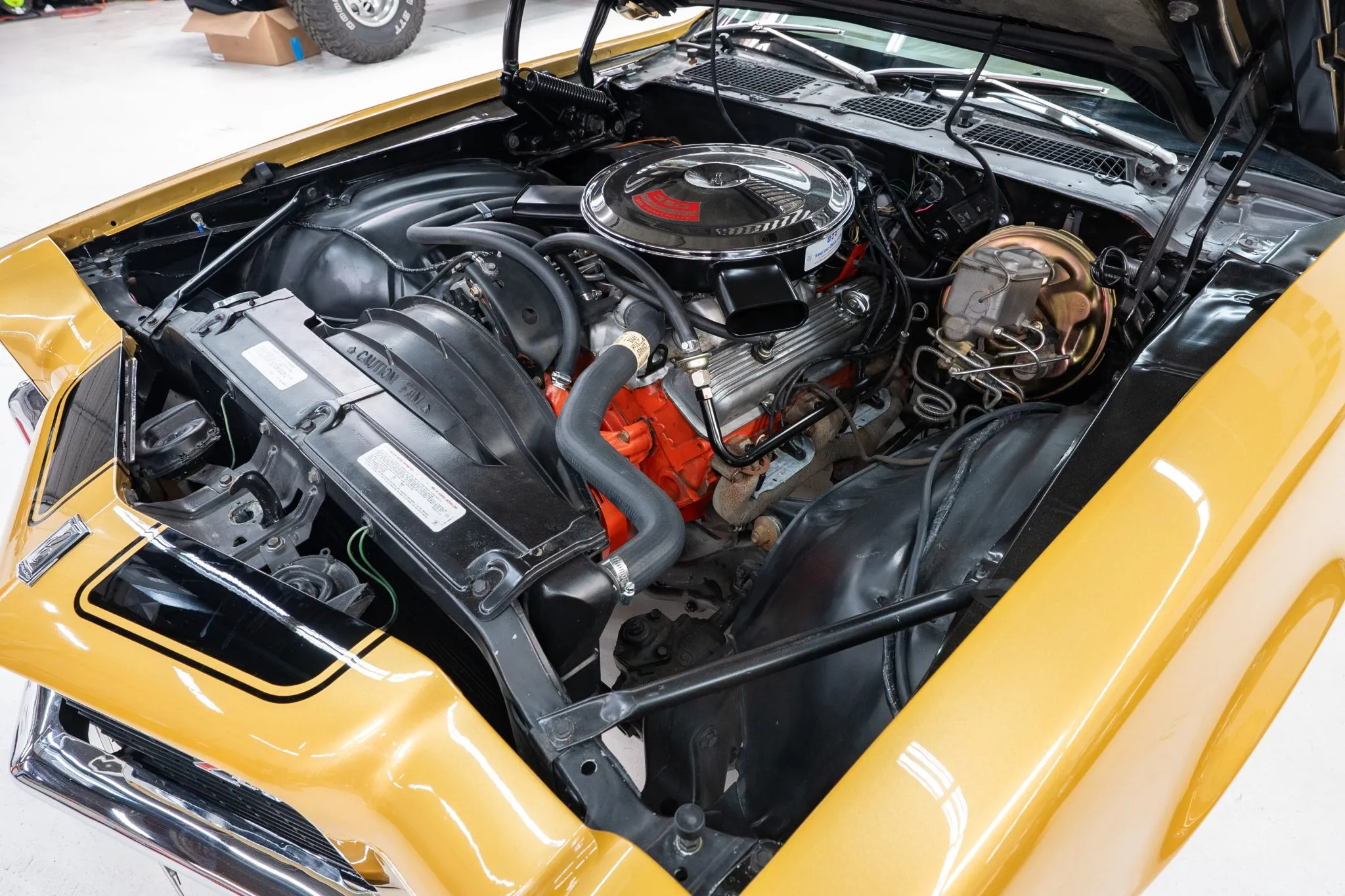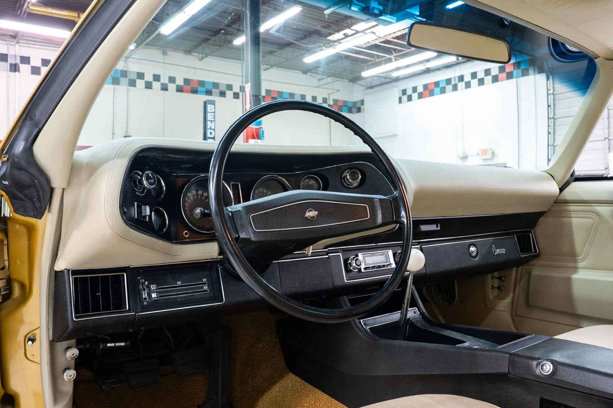 A two-spoke steering wheel is paired with a Hurst shifter and fronts a tachometer with a 6,500-rpm redlline accompanied by a 150-mph speedometer, a clock, and auxiliary gauges for fuel level, amperage, and coolant temperature. The five-digit odometer shows 22k miles, approximately 500 of which were added under last ownership. The 350ci Turbo-Fire V8 was factory equipped with a four-barrel carburetor and was rated at 360 horsepower and 380 lb-ft of torque.