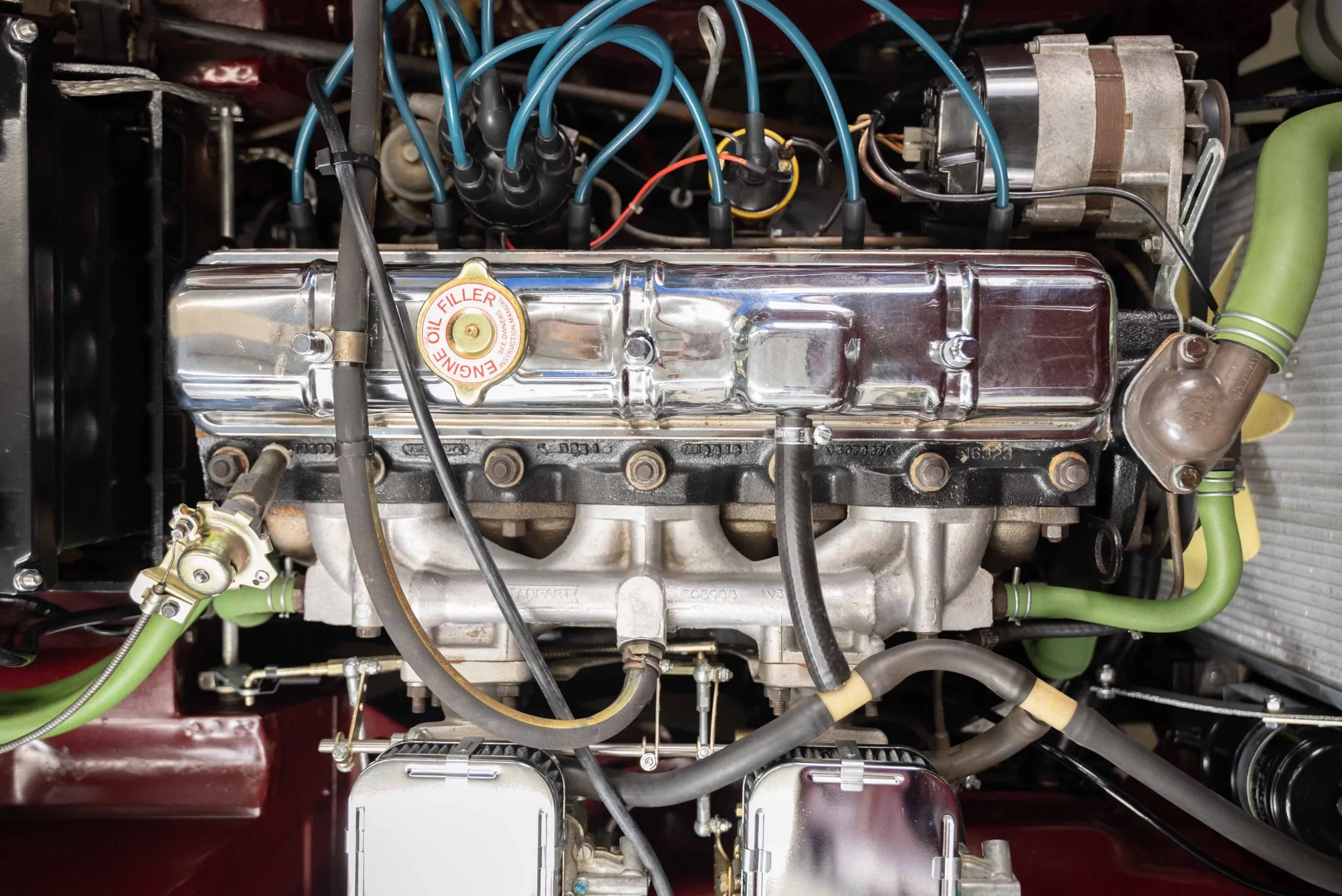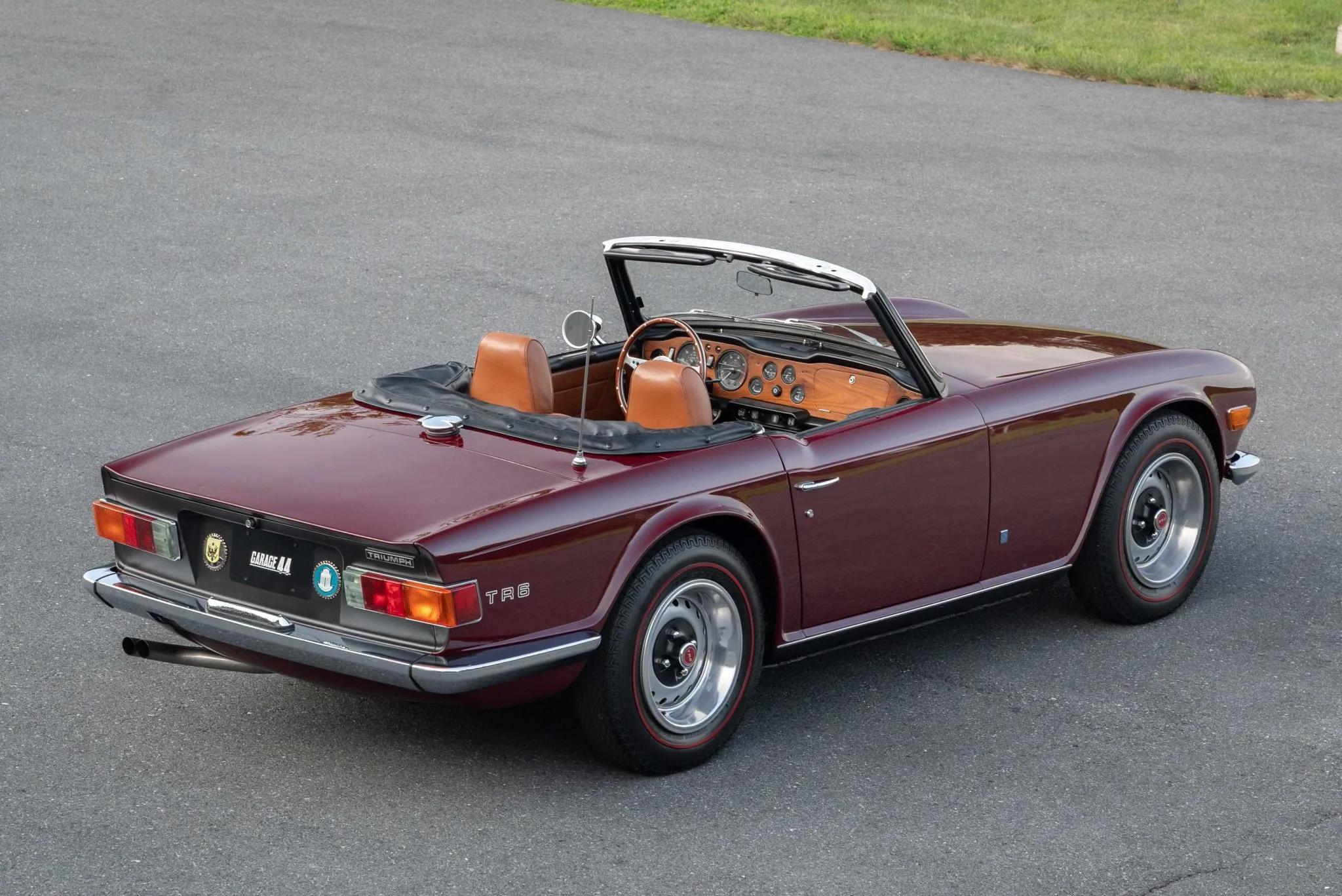 1971 Triumph TR6. The paintwork was redone on the passenger door and front fender, and the 2.5-liter inline-six received a top-end overhaul along with dual Weber downdraft carburetors and an aluminum radiator. The suspension components were powder-coated and replaced with new bushings, the front disc/rear drum brakes were overhauled, and a replacement canvas soft top was fitted. Further equipment includes a four-speed manual transmission, New Tan vinyl upholstery, factory 15″ wheels with redline tires, a stainless exhaust system, and a retro-look digital radio with Bluetooth. The instruments were removed and cleaned before being reinstalled in a replacement wood-veneer dash. A wood-rimmed Moto-Lita steering wheel frames the 140-mph speedometer and a tachometer, and the five-digit odometer shows 49k miles. The 2.5-liter inline-six received a cylinder head rebuild during the refurbishment and is fitted with dual downdraft Weber carburetors along with a Lucas sport coil and an aluminum radiator.